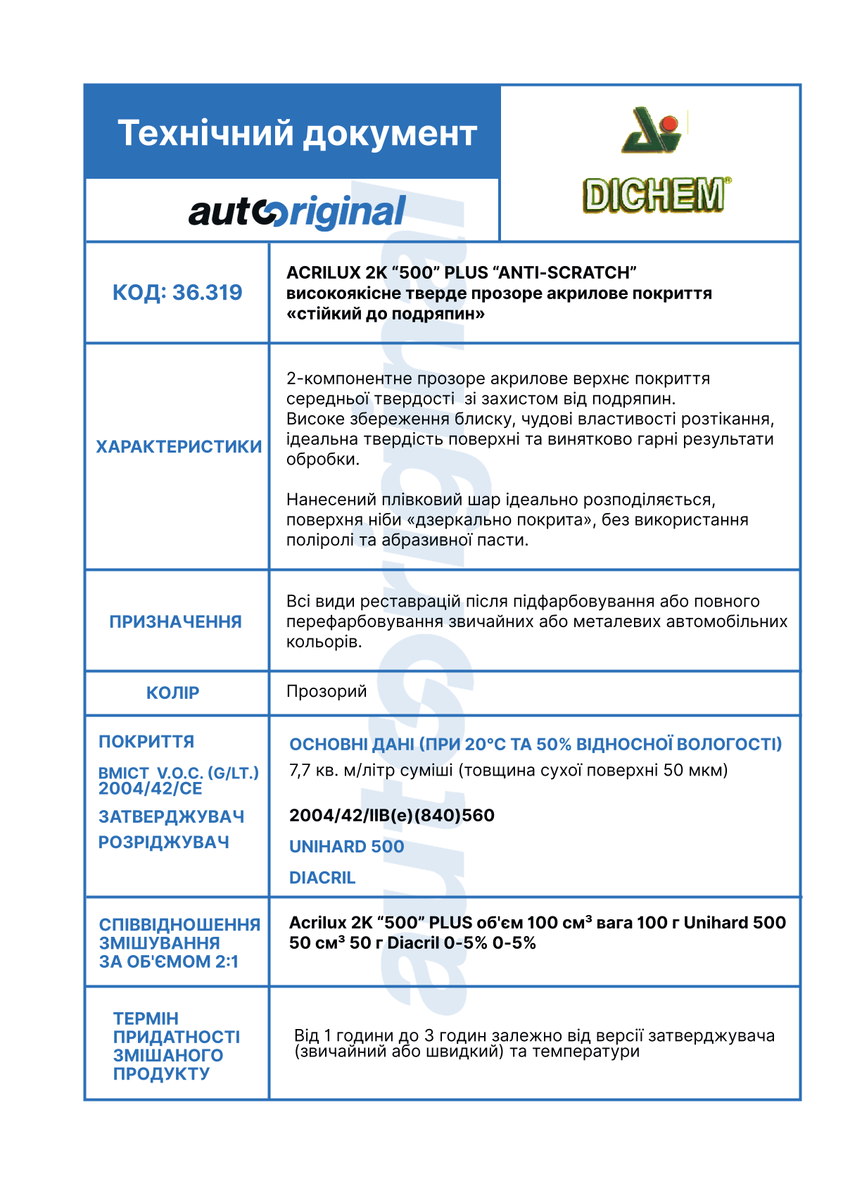| Ім'я | Лак ACRULIUX 2K 500 Plus, 1л ( затвердник 500мл, UNIHARD 500) Dichem 36.319 |