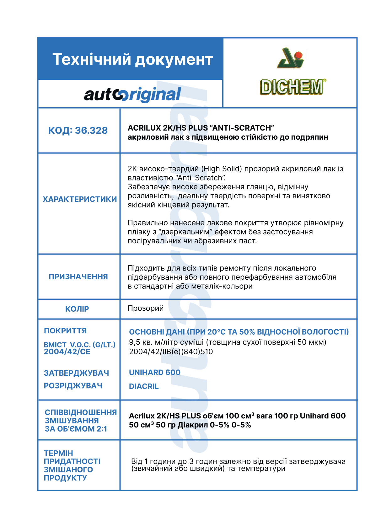 | Ім'я | Лак ACRULIUX 2K/HS PLUS ( затвердник 500мл, UNIHARD 600) Dichem 36.328 |