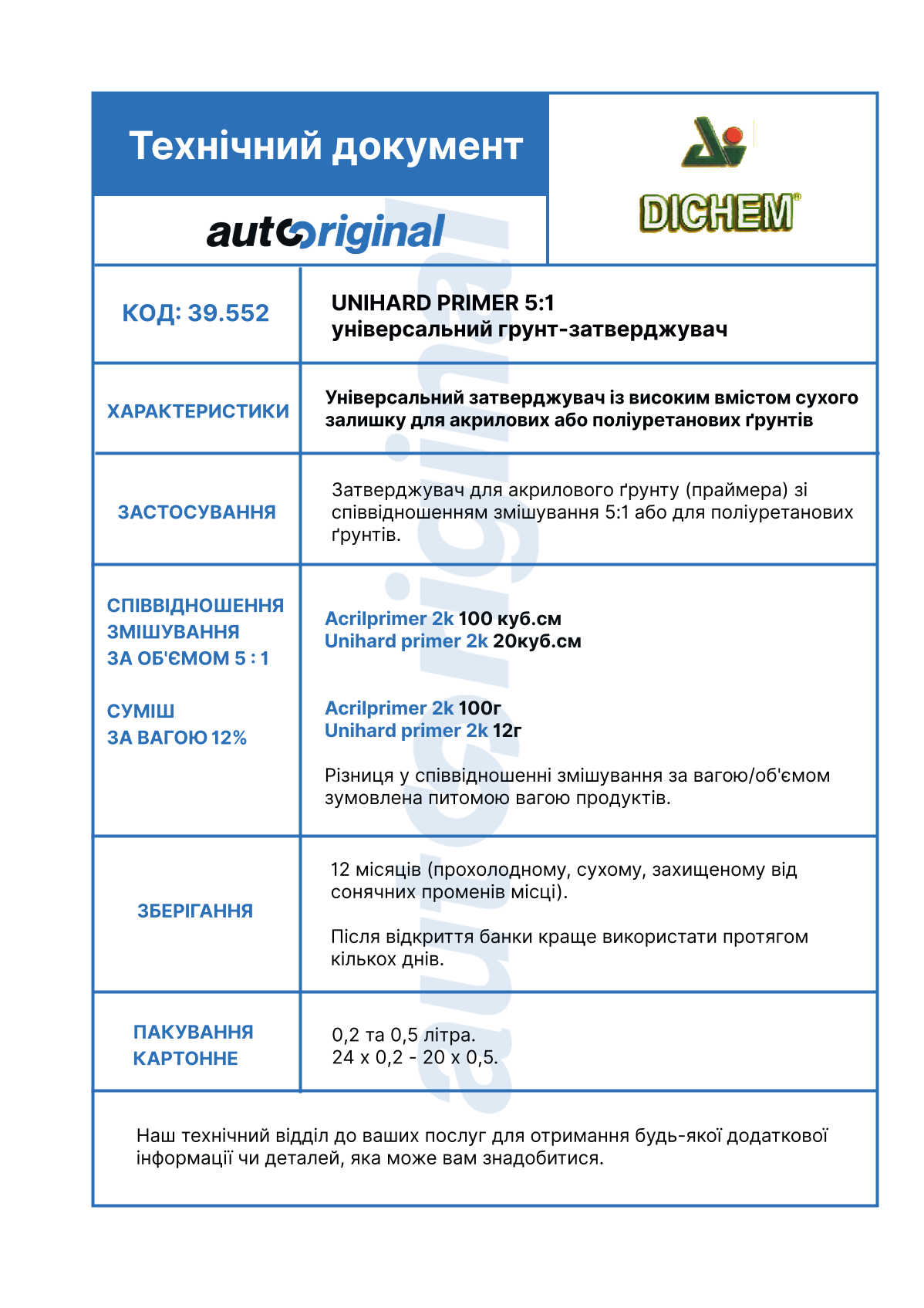 | Ім'я | Затвердник до грунта 2K 5:1 UNIHARD GOLD, Dichem 39.552 |