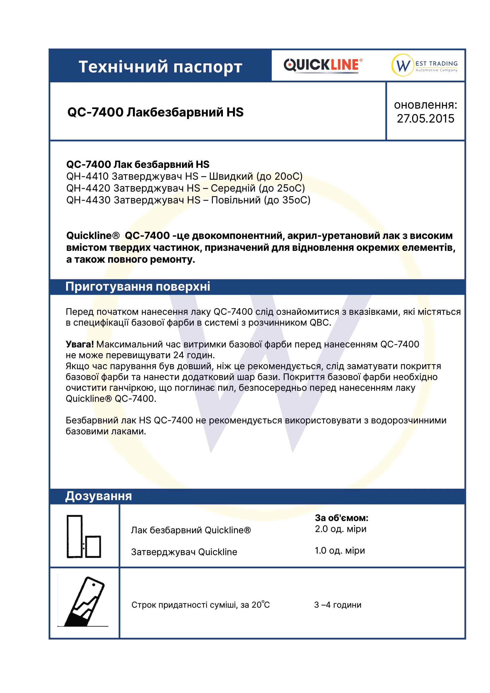 | Ім'я | Лак HS 1л, QL 7400 (затверджувач HS 0,5л, QL 4410/4420) |